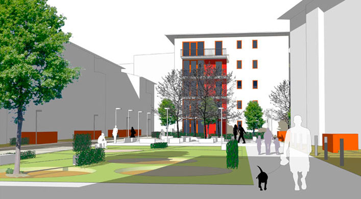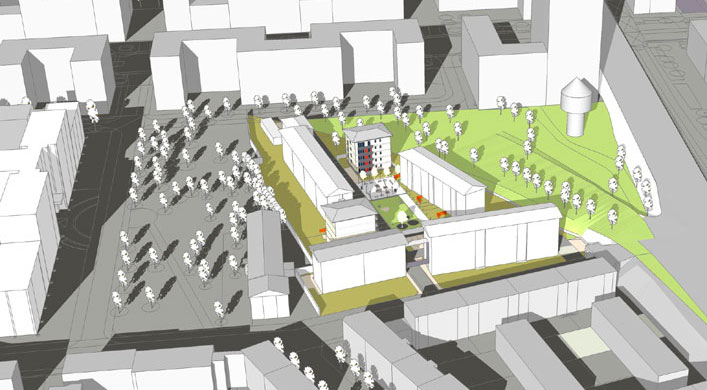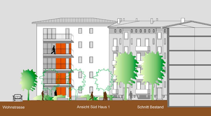 2. Rang Das Wohnviertel Knorrstraße mit Bestandgebäuden aus den 50er Jahren soll durch das Einfügen von drei zusätzlichen Wohngebäuden nachverdichtet werden. Zu untersuchen waren Größe und Standort der neuen Gebäude. Vorgeschlagen wird, zwei neue Häuser mit dem Bestand zu einem gemeinsamen Platz zu verbinden und somit die Chance zu nutzen die Wohnsituation für alle Bewohner aufzuwerten. Durch die Platzgestaltung entsteht ein neuer Treffpunkt und Identifikationsort für alle Anwohner. Für die neuen Gebäude wurde ein 5-geschossiger Grundtypus entwickelt. Die Häuser wurden so konzipiert, dass sich von den Wohnräumen der Blick zum Platz eröffnet. Die Gebäude sind bewusst zurückhaltend gestaltet und fügen sich in die bestehende Gebäudesprache der 50er Jahre ein. Gleichzeitig sind, mit den Fensterformaten und den Holzpaneelen, moderne gestalterische Elemente aufgenommen. |