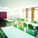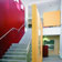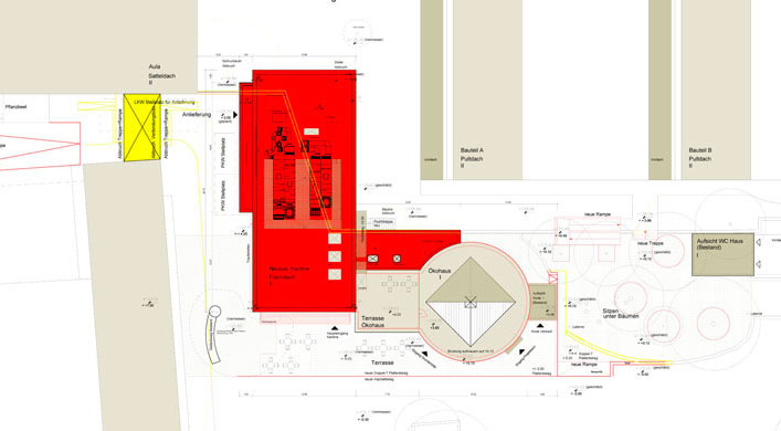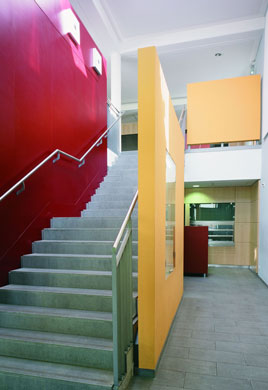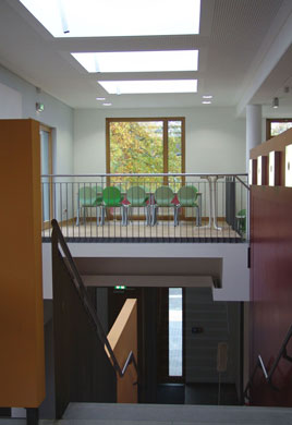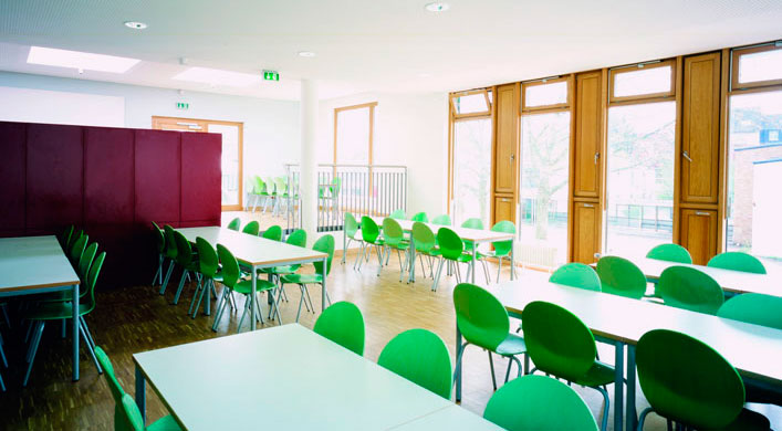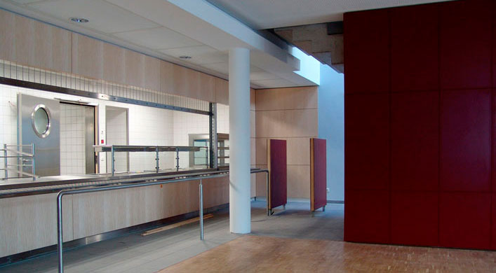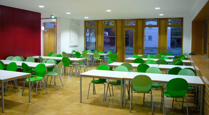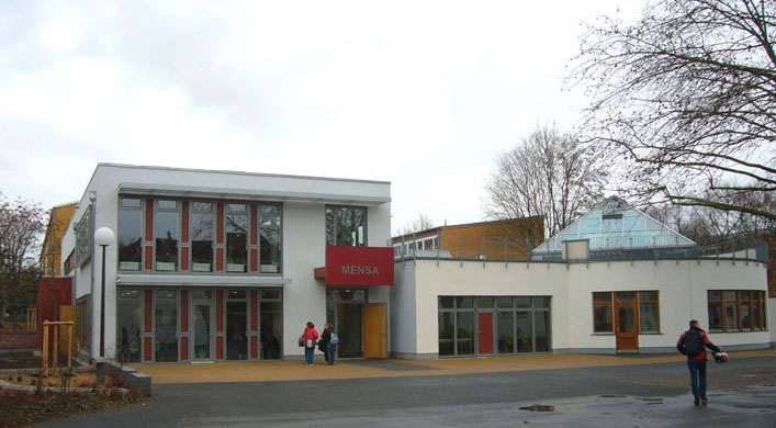 Neubau Mensa an bestehendes Gebäude Das Gymnasium mit 1.400 Schülern hat im Jahr 2007 einen Kantinenneubau erhalten. Der Neubau liegt im nordwestlichen Teil des Schulhofes und ist direkt an das bestehende ‚Ökohaus’ angebaut. Dieses wurde 1998 in Eigeninitiative der Schule errichtet und besitzt für die Schule einen hohen Stellenwert. Mit dem Anbau der Kantine erhält das Ökohaus eine zusätzliche öffentliche Funktion, wodurch der Gesamtkomplex zu einem neuen Herzstück und Mittelpunkt der Schule gewachsen ist. Der Kantinenneubau bietet auf zwei Ebenen Platz für ca. 770 Schüler. Für die Essensversorgung der Schule in drei Schichten stehen zwei Ausgaben und drei Speiseräume zur Verfügung. Einer davon befindet sich im renovierten Teil des Ökohauses. Die hohen Holzfenster mit integrierten Lüftungsklappen erzeugen einen hellen lichtdurchfluteten Innenraum mit Blick auf die Bäume im Schulhof.Vom oberen Speiseraum der Kantine ist eine kleine Dachterrasse auf dem Ökohaus zu erreichen.Neben der Errichtung einer großzügigen Terrasse an der Südseite des Neubaus wurde der gesamte Bereich um den Neubau und dem Ökohaus mit einer neuen Aussen-gestaltung versehen. Das Farbkonzept und die Innenraumgestaltung der Speiseräume setzen sich mit warmen Farben und dem Einsatz von Holz an Wänden und Boden bewußt von den funktionellen Klassenräumen ab und erzeugt eine wohnliche Stimmung. |